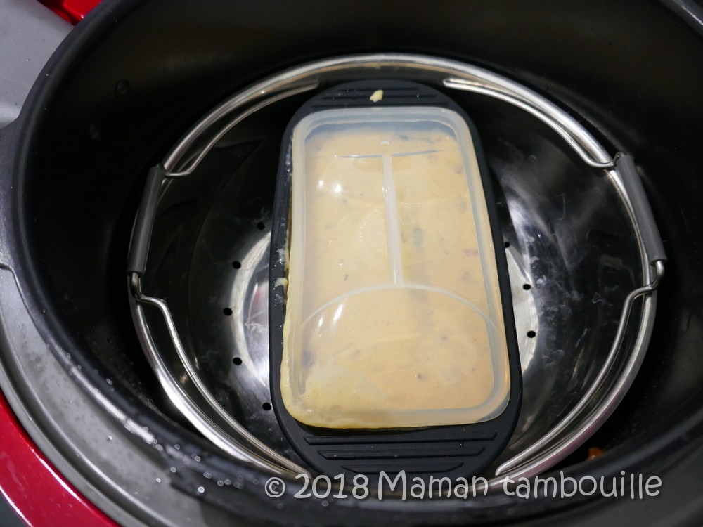 J’ai choisi de cuire ma terrine sous pression au cookeo. J’ai mis le couvercle sur la terrine, je l’ai posé dans le panier vapeur, ajouté 300ml d’eau dans le cookeo et lancer la cuisson sous pression pour 30 min.