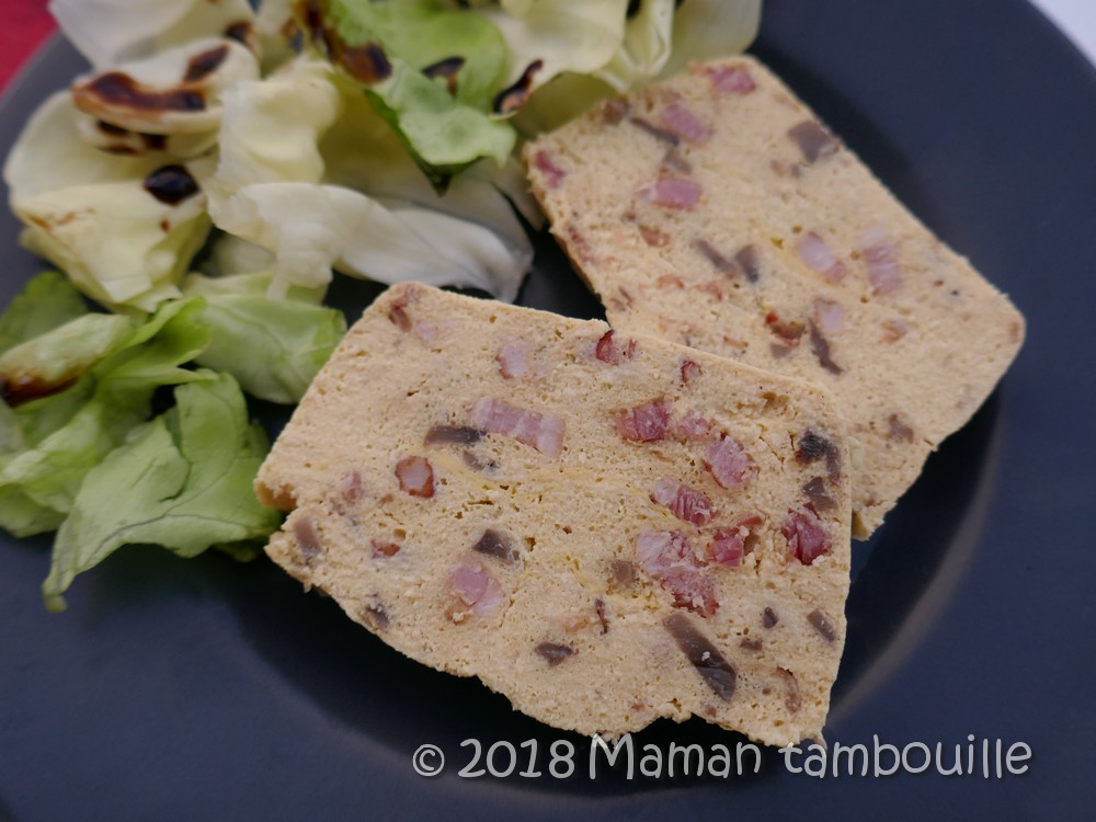 J’aurai voulu faire mieux et plus sophistiqué mais j’ai été prise par le temps et les journées chargées. J’ai choisi de faire une terrine de poulet aux champignons et lardons. C’est joli à présenter, ça se tient bien à la découpe et surtout c’est agréable à manger. Il manquait juste une petite sauce d’accompagnement mais j’ai manqué d’inspiration et je n’avais pas envie d’une mayonnaise. Si vous avez des idées de sauce, je suis toute ouïe à vos suggestions !