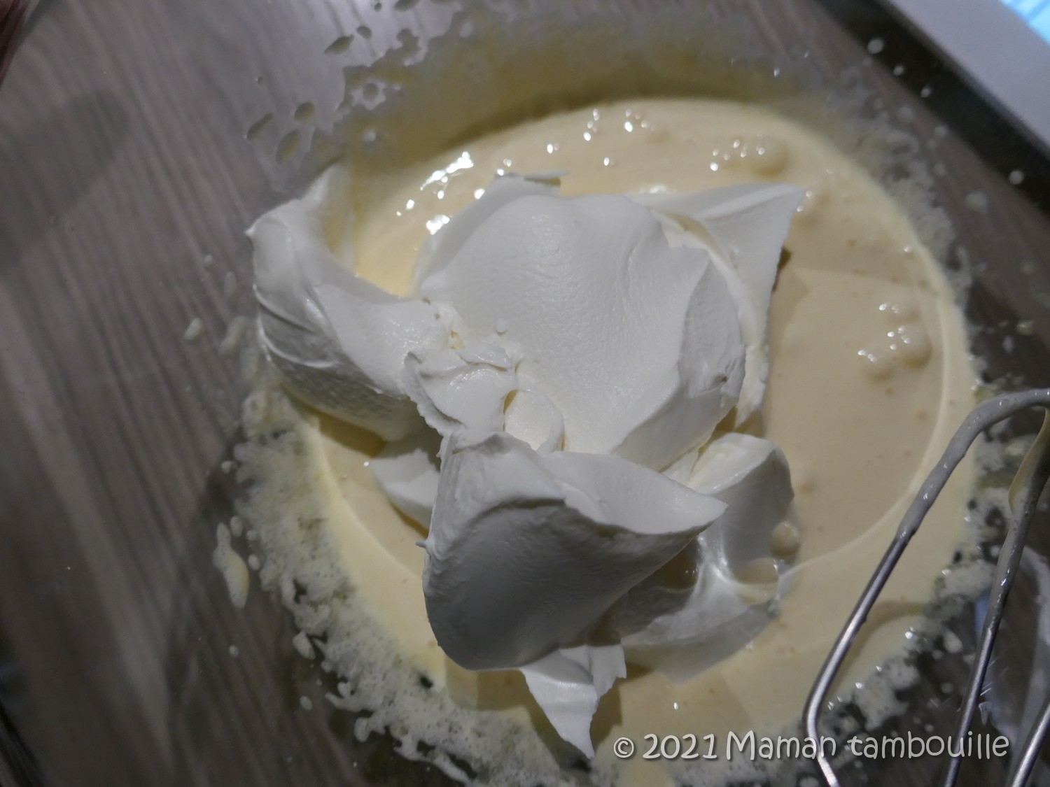 Ajouter les blancs dans le mélange de mascarpone et les incorporer délicatement avec une spatule.
