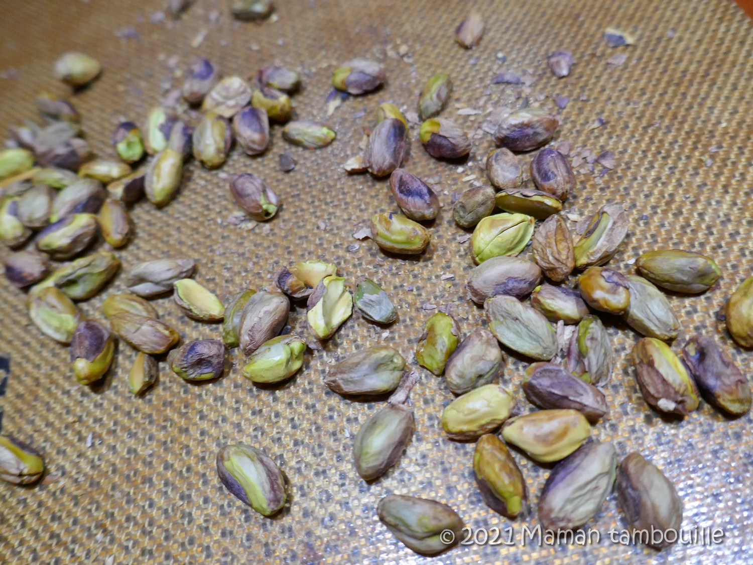 Mettre les pistaches sur une plaque de cuisson et torréfier 10 min à 150°.