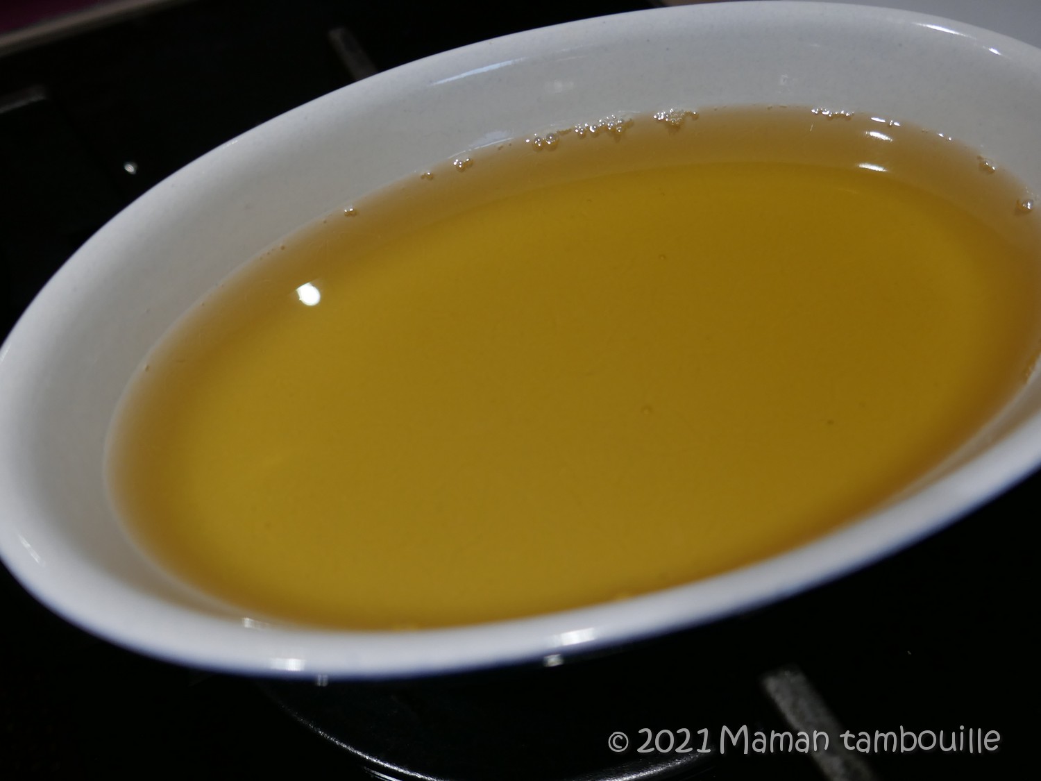 Hors du feu, ajouter le miel et la fleur d’oranger. Mélanger puis verser dans un petit plat.