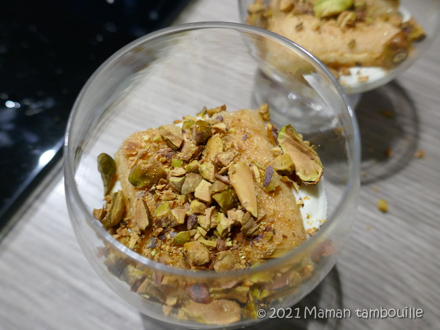 On garde l’esprit tiramisu avec la mascarpone et les biscuits imbibés mais on vire le café pour le remplacer par un sirop de miel à la fleur d’orange. On rajoute des éclats de pistache torréfiés et nous voilà avec un tiramisu aux saveurs orientales. Perso, j’ai beaucoup aimé parce que je suis fan du combo fleur d’oranger/pistache.