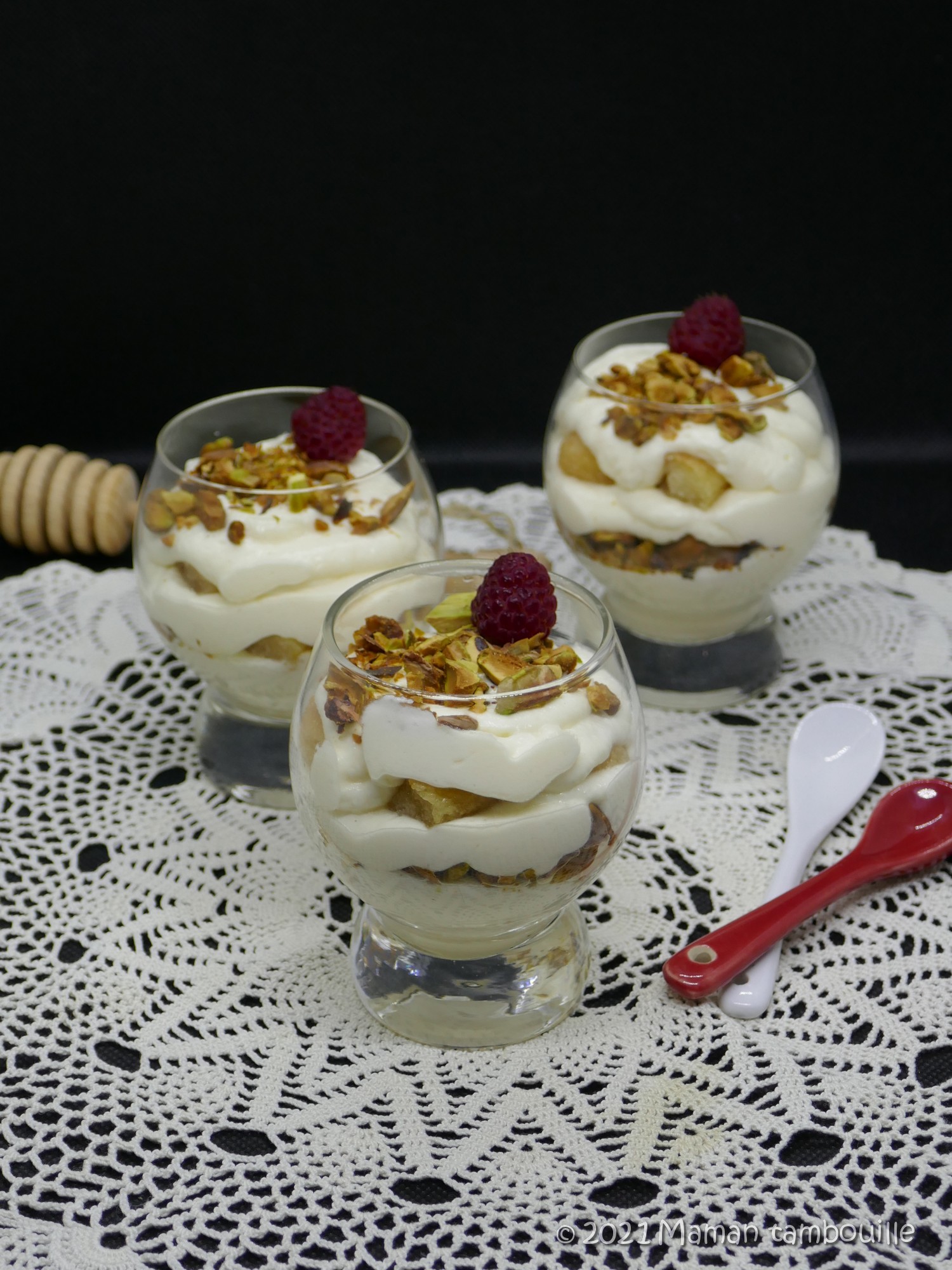 On garde l’esprit tiramisu avec la mascarpone et les biscuits imbibés mais on vire le café pour le remplacer par un sirop de miel à la fleur d’orange. On rajoute des éclats de pistache torréfiés et nous voilà avec un tiramisu aux saveurs orientales. Perso, j’ai beaucoup aimé parce que je suis fan du combo fleur d’oranger/pistache.