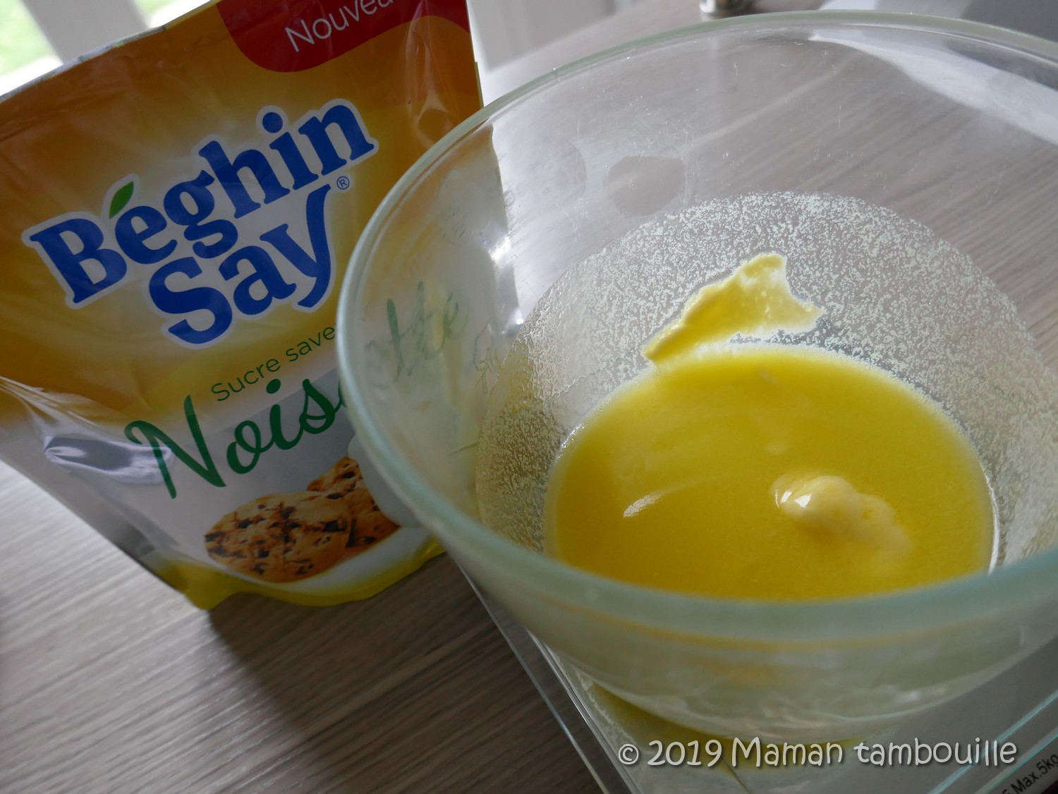 Faire fondre le beurre au micro ondes. Il doit être juste fondu mais pas chaud.