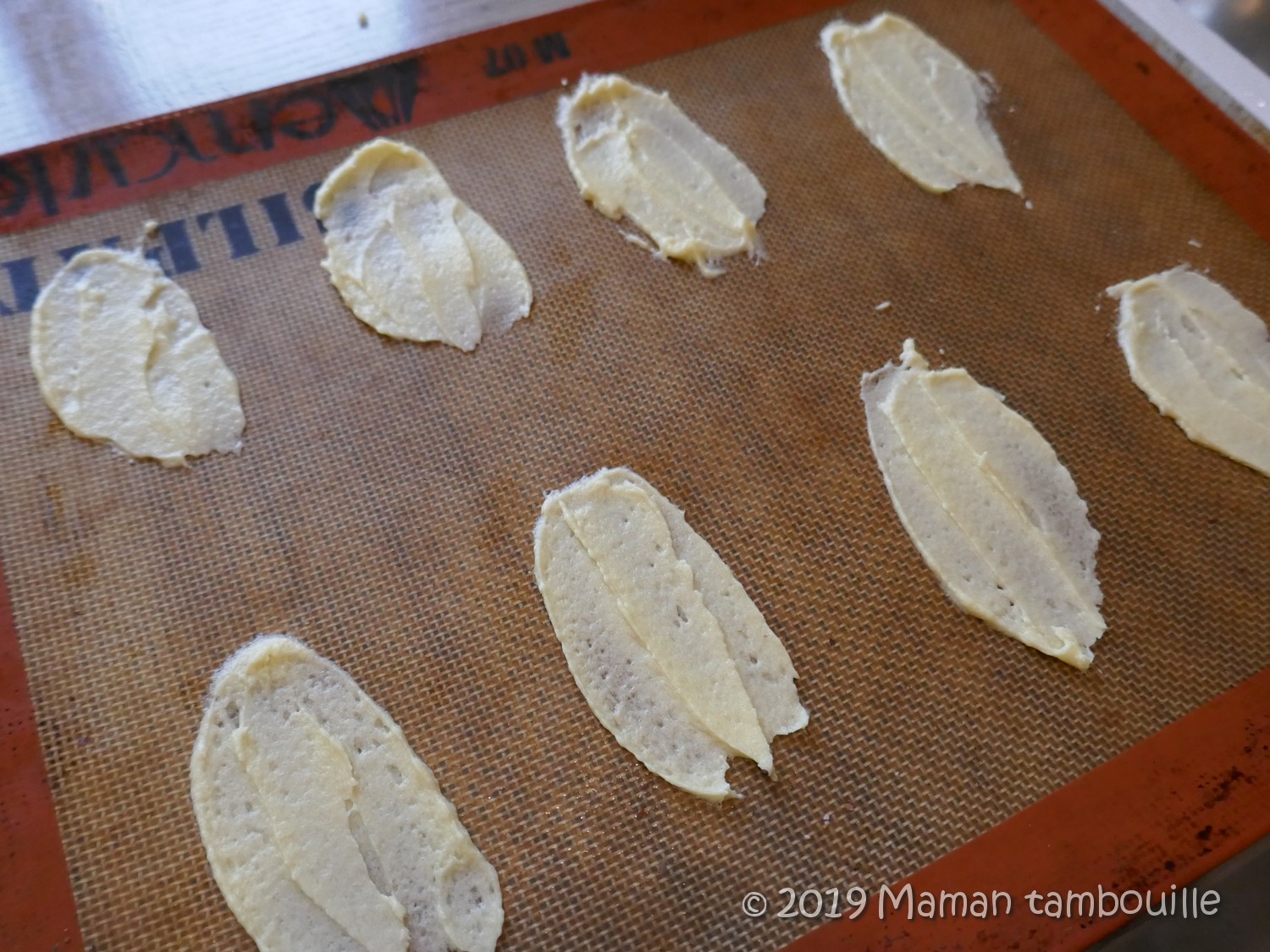 Déposer une noisette de pâte sur une silpat posée sur une plaque perforée. Etaler en très fine couche avec le dos d’une cuillère. J’ai fait 8 tuiles par plaque.