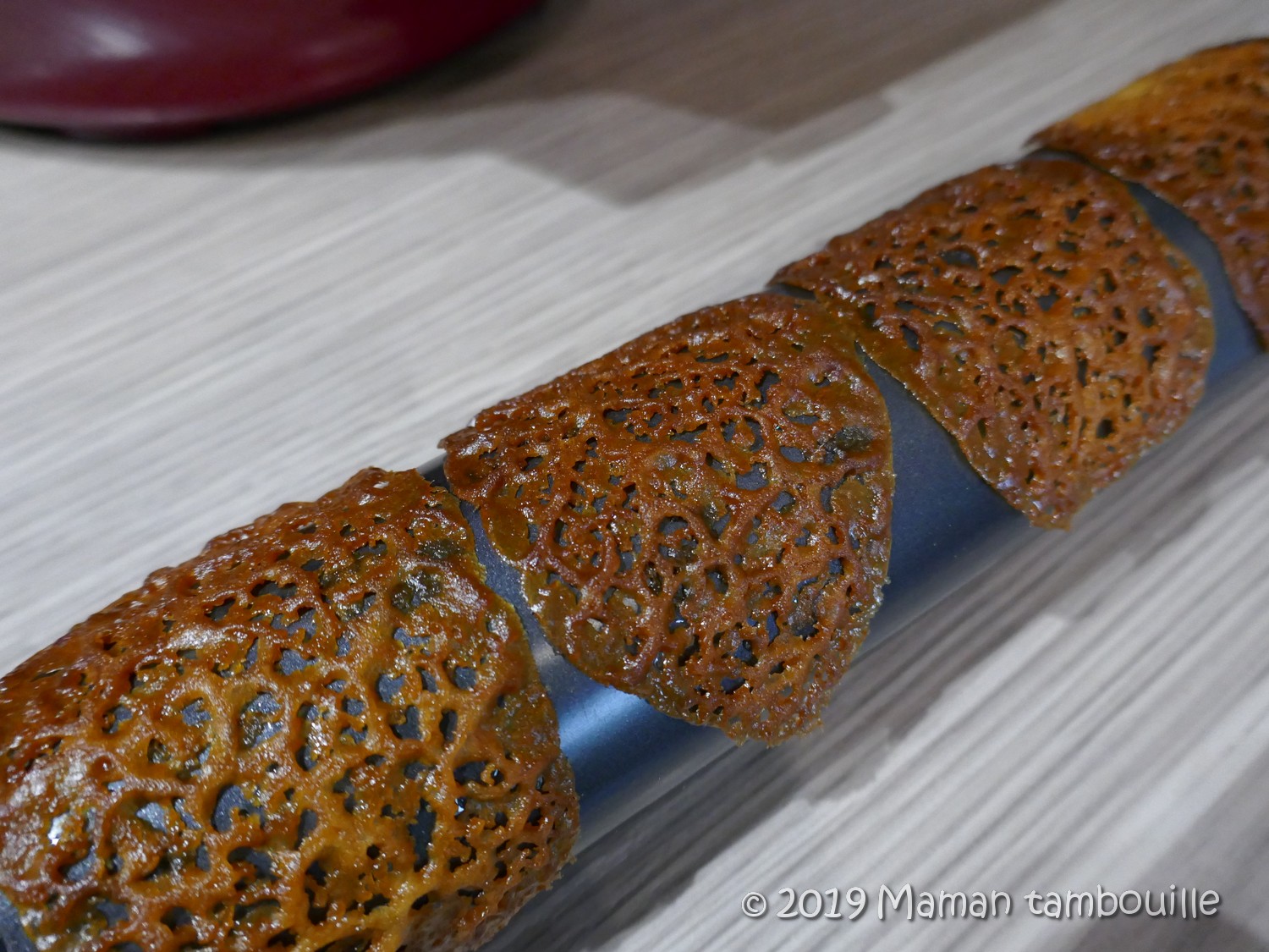 Les retirer encore chaudes avec une spatule et les poser sur un rouleau à pâtisserie si on veut leur donner une forme de tuile (si on ne veut pas s’embêter, les laisser plates ça marche aussi 😉 ).