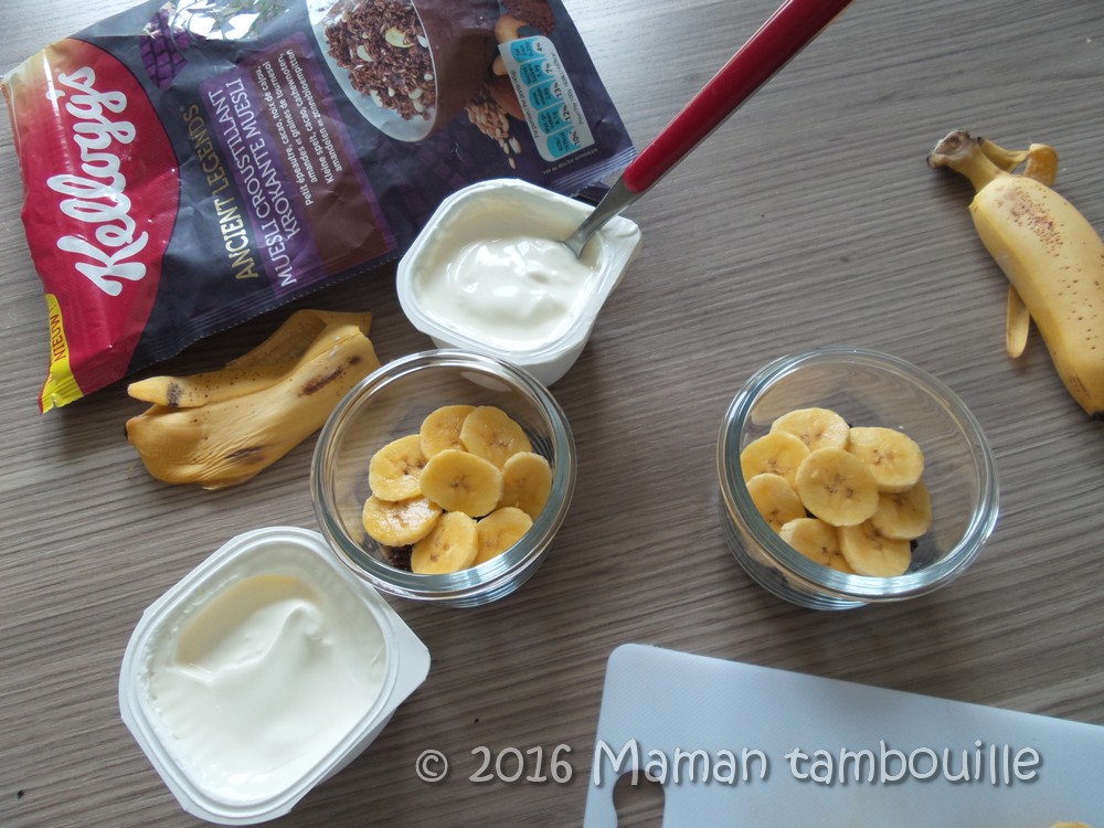 Couvrir de rondelles de bananes (les bananes vont faire une barrière étanche entre le fromage blanc et les céréales pour éviter de détremper ces dernières).