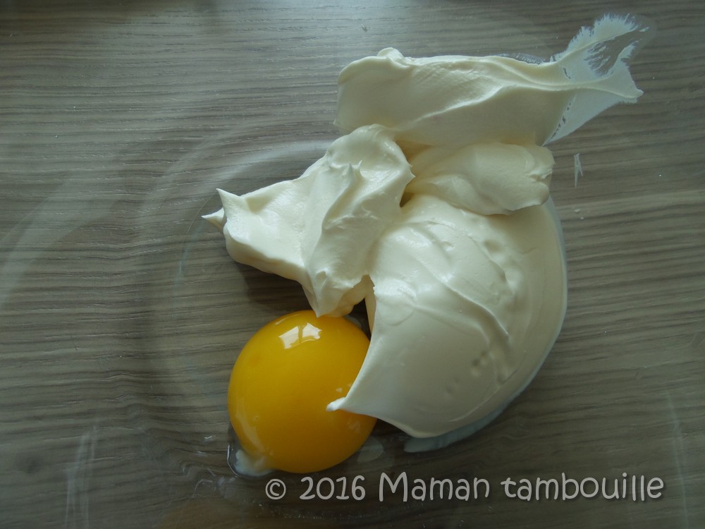 Dans un saladier, mettre le jaune d’œuf et le mascarpone.