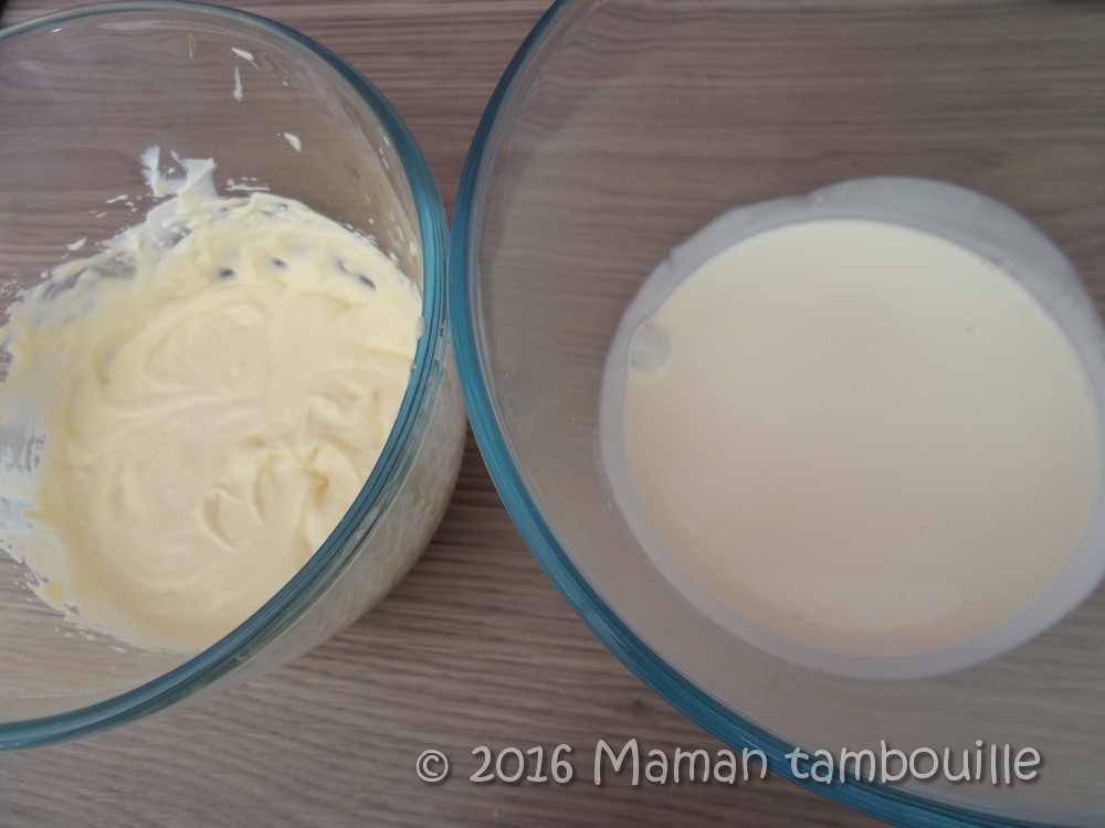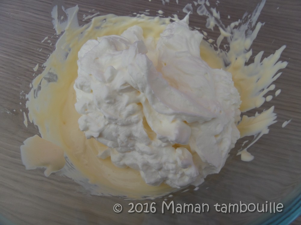 Mettre la crème fouettée dans le mélange de mascarpone et mélanger délicatement avec une spatule.