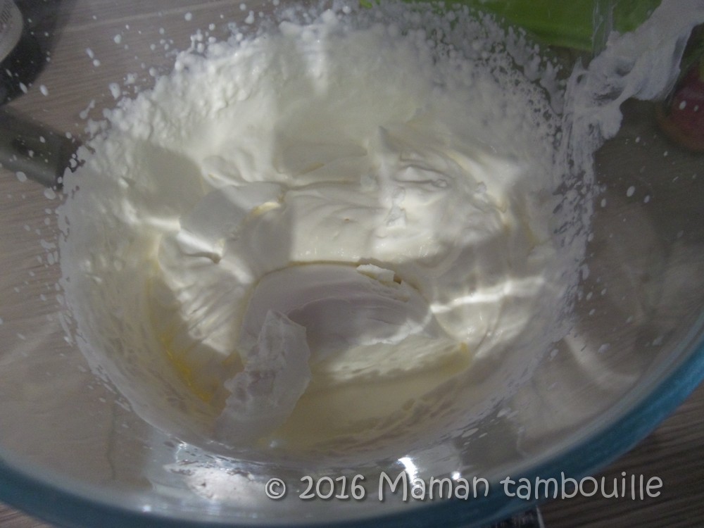 Quand la crème est ferme, ajouter le chèvre et fouetter encore quelques instants.