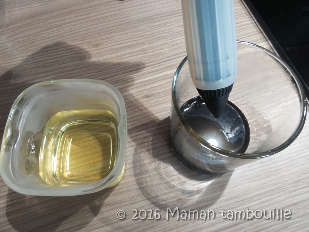 - de l’huile très froide (un grand verre d’huile placé au frigo la veille. Le verre doit être haut)