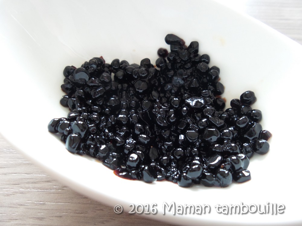 Quand il ne reste plus de balsamique, verser dans une passoire et rincer doucement les billes à l’eau froide.