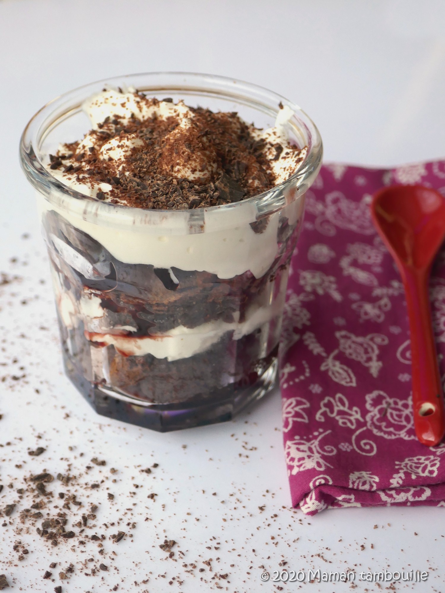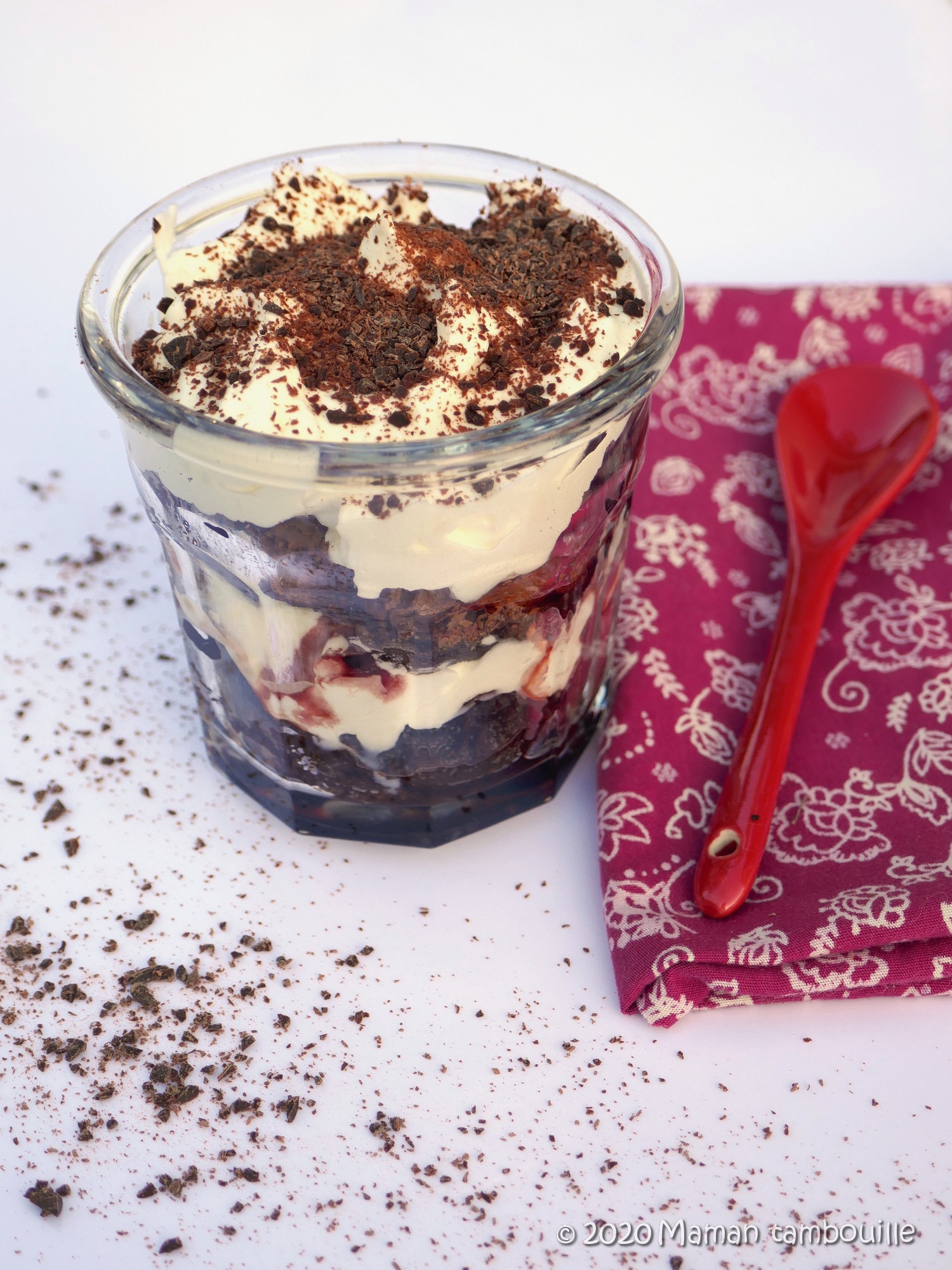 Un anniversaire confiné pour Papa Tambouille alors on fait avec les moyens du bord pour faire un petit dessert quand même 😉 Monsieur adore les forêts noires mais c’est un peu long à faire et je manquais de temps alors voilà, des petites verrines façon forêt noire réalisées avec ma louloute. Rien de compliqué: j’ai fait ma recette de fondant au chocolat qu’on adore, une chantilly maison et des cerises amarena. Pas de kirsch, à la place, j’ai utilisé le sirop des cerises.